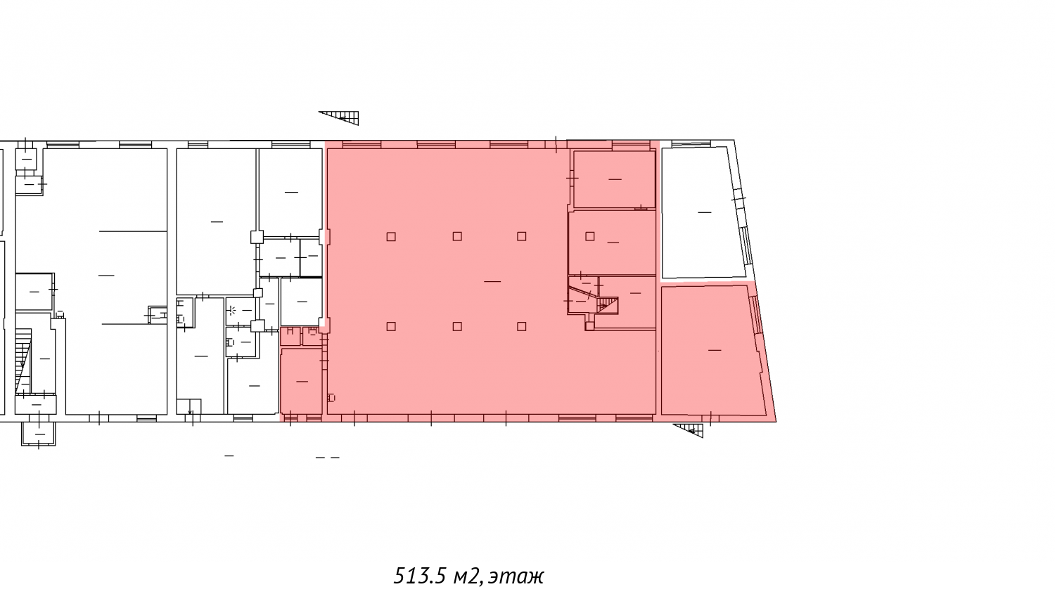 Характеристики помещения: площадь 1-го этажа - 513.5 кв. м, площадь антресоли - 77.5 кв. м.