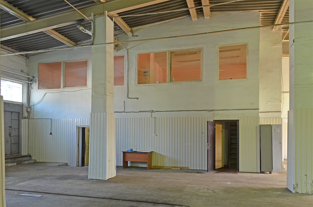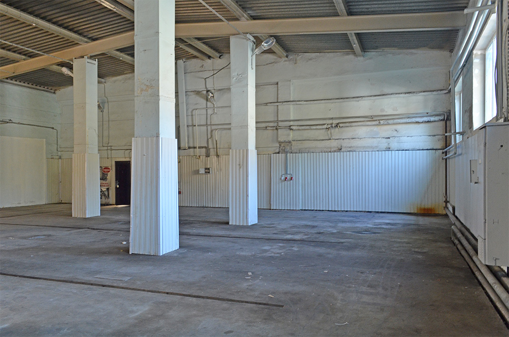 Высота потолков 6.11-6.90 м, двое роллетных ворот (3 х 4 м, 3 х 3м), бетонный пол, санузел, удобный подъезд для любого грузового транспорта.